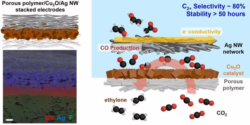 O ponto mais interessante é que os nanofios de prata não ficaram restritos ao papel de condutores. Eles produziram monóxido de carbono durante a redução eletroquímica do CO2, e esse intermediário foi então transferido para os catalisadores à base de cobre, onde novas etapas reacionais ocorreram. Em termos práticos, isso cria um sistema tandem, no qual dois componentes trabalham em sequência para empurrar a química até produtos com mais átomos de carbono. Esse tipo de desenho interessa porque a formação de moléculas C2+ costuma ser mais difícil do que gerar produtos simples, mas é justamente ela que aponta para um uso industrial mais valioso.