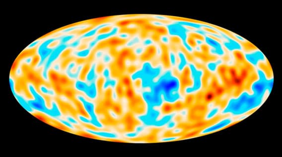 A luz do universo inicial mostra algo que não é bom. Observe o contraste das manchas ligeiramente mais brilhantes e as que são um pouco mais fracas. Estas correspondem às mudanças de temperatura do universo em uma escala de 1 parte em 100.000. Que é incrivelmente pequena, mas tem profundas implicações. Pensamos que essas flutuações foram impressas no universo quando era apenas um trilionésimo de um trilionésimo de um segundo de idade, e cresceram com o universo, juntamente com a expansão elas expandiram-se. Elas também foram as origens da galáxias e aglomerados e galáxias que vemos hoje.