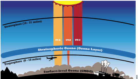 Normalmente, a camada de ozônio na atmosfera superior protege a superfície da Terra da luz ultravioleta prejudicial. Mas uma GRB ou supernova rapidamente eviscerou essa camada. Os raios UV penetrariam na superfície do planeta e quebrariam as moléculas de oxigênio que, por sua vez, formariam moléculas de ozônio na troposfera, de acordo com o astrofísico da Universidade Washburn Brian Thomas. Vemos esse tipo de ozônio em dias poluídos quentes quando os alertas de poluição atmosférica nos avisam para ficar dentro de casa por motivos de saúde. Mas será que o ozônio ao nível do solo criou-se depois de um GRB representar uma ameaça biológica a longo prazo? Thomas e seu colega Byron Goracke investigaram a gravidade deste ozônio troposférico e os seus efeitos potenciais sobre a vida utilizando um modelo atmosférico para simular um caso particular de um GRB ocorrendo sobre o Pólo Sul.