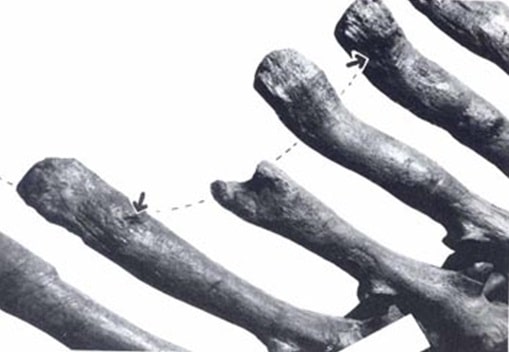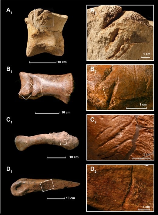 Fig. A.2; Tyrannosaurus rex ossos de dente tendo marcas feitas por Tyrannosaurus rex. A1, A2: pedal falange em vista dorsal. B1, B2: falange Pedal, vista dorsal. C1, C2, úmero tendo em vista caudal. D1, D2 metatarso III do T. rex, vista medial.