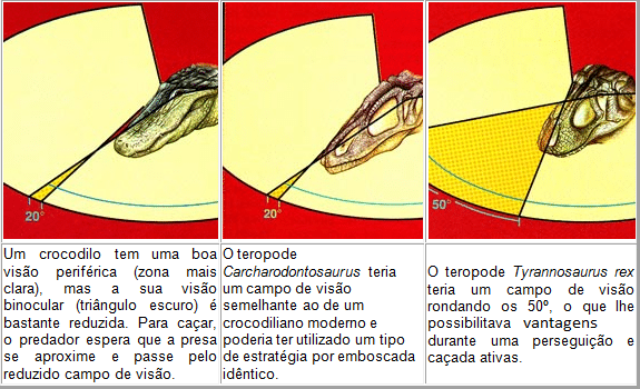 Stevens (1998) sugeriu, através da utilização de lasers em réplicas de crânios de vários teropodes, que estes carnívoros possuíam uma visão binocular, com ambos os olhos trabalhando conjuntamente e fornecendo uma percepção em profundidade, características presentes em muitos dos predadores modernos. Verificou que Tyrannosaurus, Velociraptor e Troodon teriam campos binoculares de visão muito amplos, 50 º ou mais, semelhantes aos dos atuais falcões. Allosaurus e Carcharodontosaurus teriam um campo de visão inferior (cerca de metade), comparável ao dos atuais crocodilianos, que são “predadores de emboscada”. Stevens suspeita que a capacidade de visão global de tiranossaurídeos, velociraptoranos e troodontídeos se situaria entre a dos atuais predadores por emboscada e os predadores com maior capacidade visual. Os que possuíam campos binoculares mais amplos poderiam ter utilizado a sua estereopsia em ataques noturnos. Stevens sugere ainda que um Tyrannosaurus rex seria um predador porque os teropodes com campo de visão mais amplo também apresentam algumas características craniais, como focinhos mais baixos e uma menor quantidade de obstruções ósseas em torno dos olhos (que diminuiriam a sua capacidade binocular). Stevens sugere que a capacidade de enxergar em profundidade, juntamente com várias características do crânio, permitiriam que um teropode como Tyrannosaurus rex pudesse ter utilizado técnicas de caçada idênticas às de predadores atuais como os falcões. “É óbvio que estes dinossauros estavam bem adaptados para este estilo de vida”.